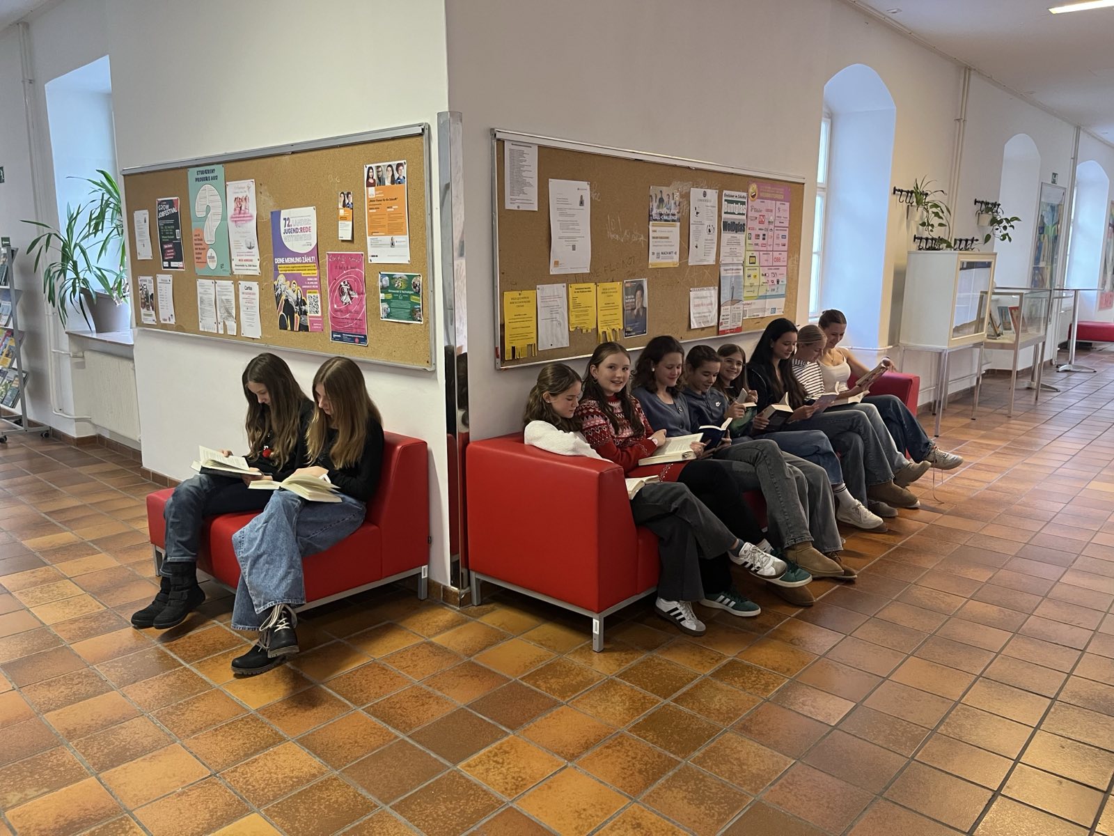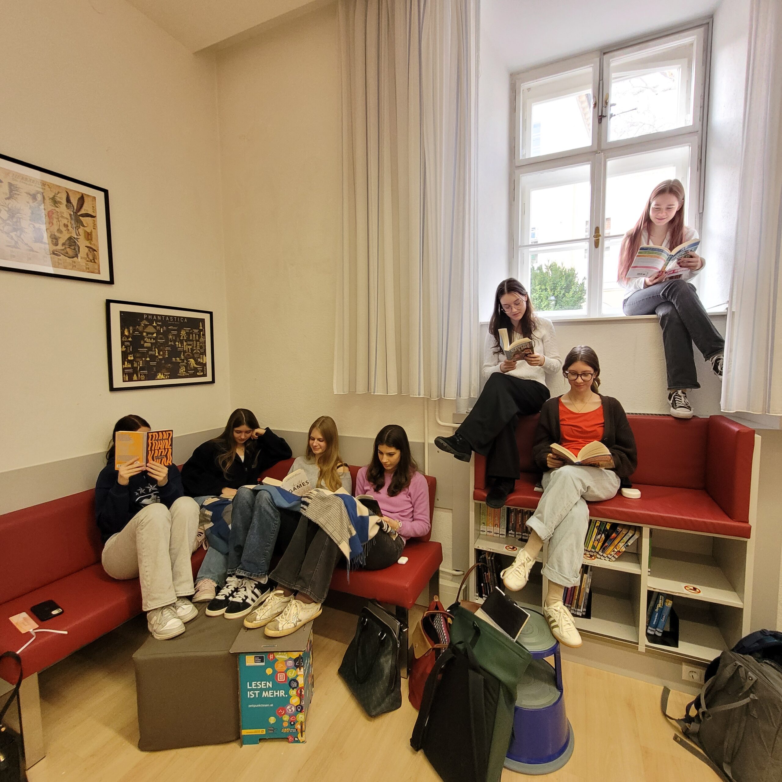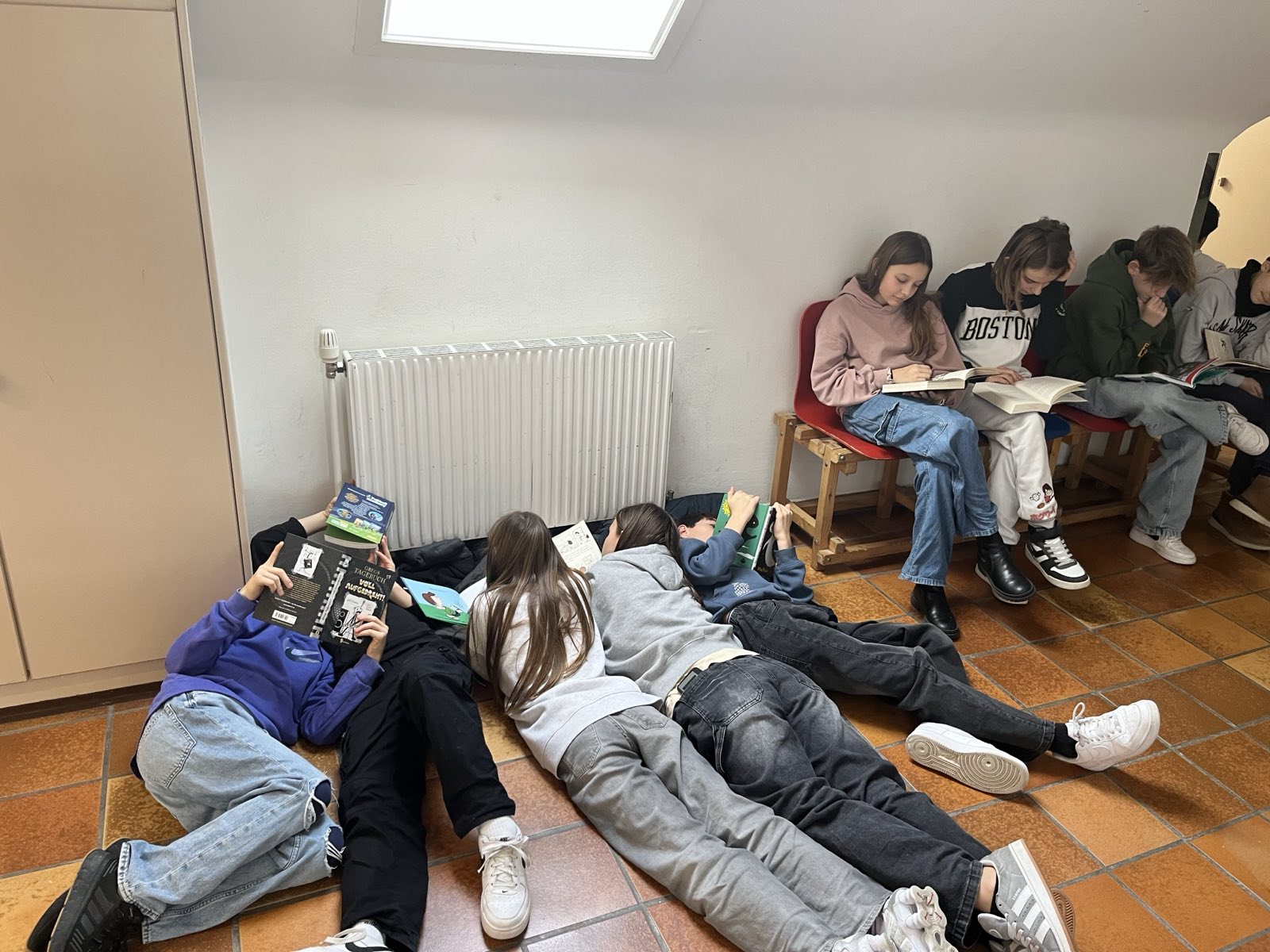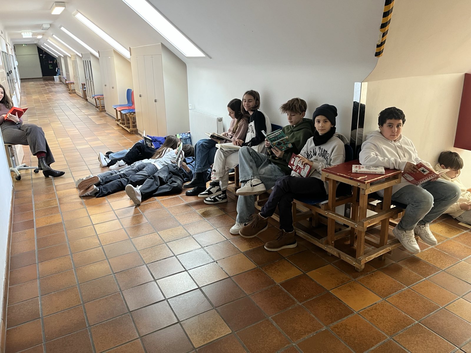 Alle Schulklassen nutzten die dritte Stunde dafür, um in ein mitgebrachtes Buch einzutauchen und gemeinsam die Atmosphäre des Lesens zu genießen. Einige Vergessliche flitzten noch schnell in die Schulbibliothek, um ein „Last-Minute-Buch“ auszuborgen.